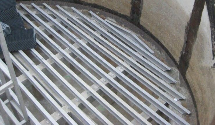 The media support system is a network of composite material beams (FRP) directly positioned on the concrete reservoir. The beams are used for the installation and support of the bacterial media supports during the erection phase throughout the trickling filter’s life cycle.